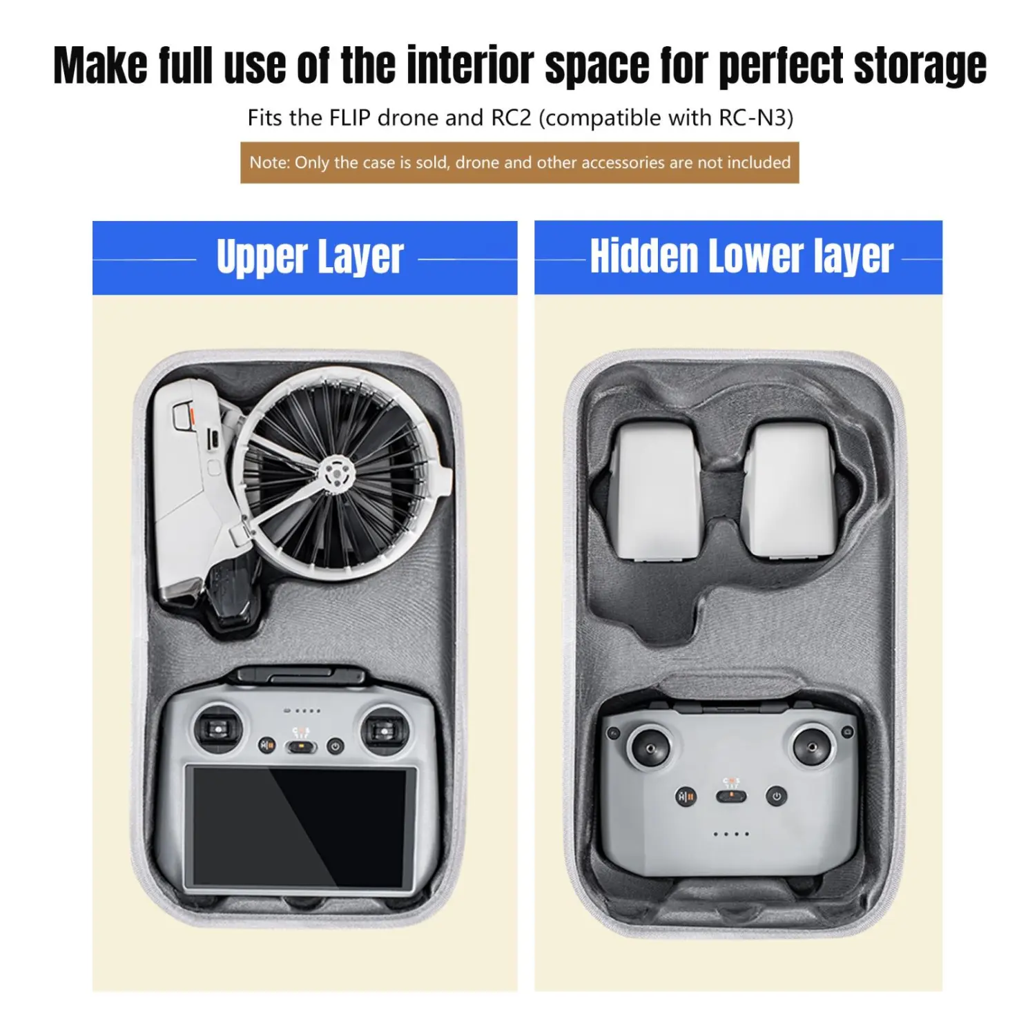 1. Strong compatibility. The storage bag is specially designed for DJI Flip, which fits the device precisely and is ideal for storage. It can store Flip aircraft, RC2 (compatible with RC-N3), 2 original battery slots, and can meet the storage requirements of the standard package. The upper net pocket can be used as a custom space to store some related small accessories, such as charging cables, charging heads, etc.