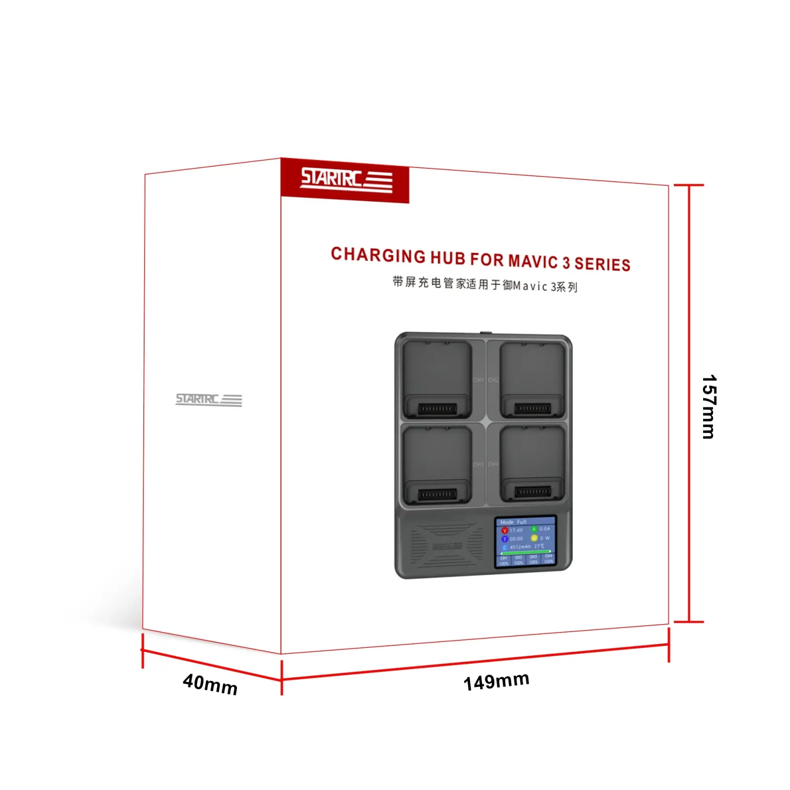 2. It can charge four Mavic 3 Pro / Mavic 3 Classic / Mavic 3 Cine / Mavic 3 batteries. The batteries are charged in order from high to low battery power, eliminating the hassle of plugging and unplugging multiple batteries one by one when charging. 1 It takes about 75 minutes to fully charge the 5000mAh battery.
