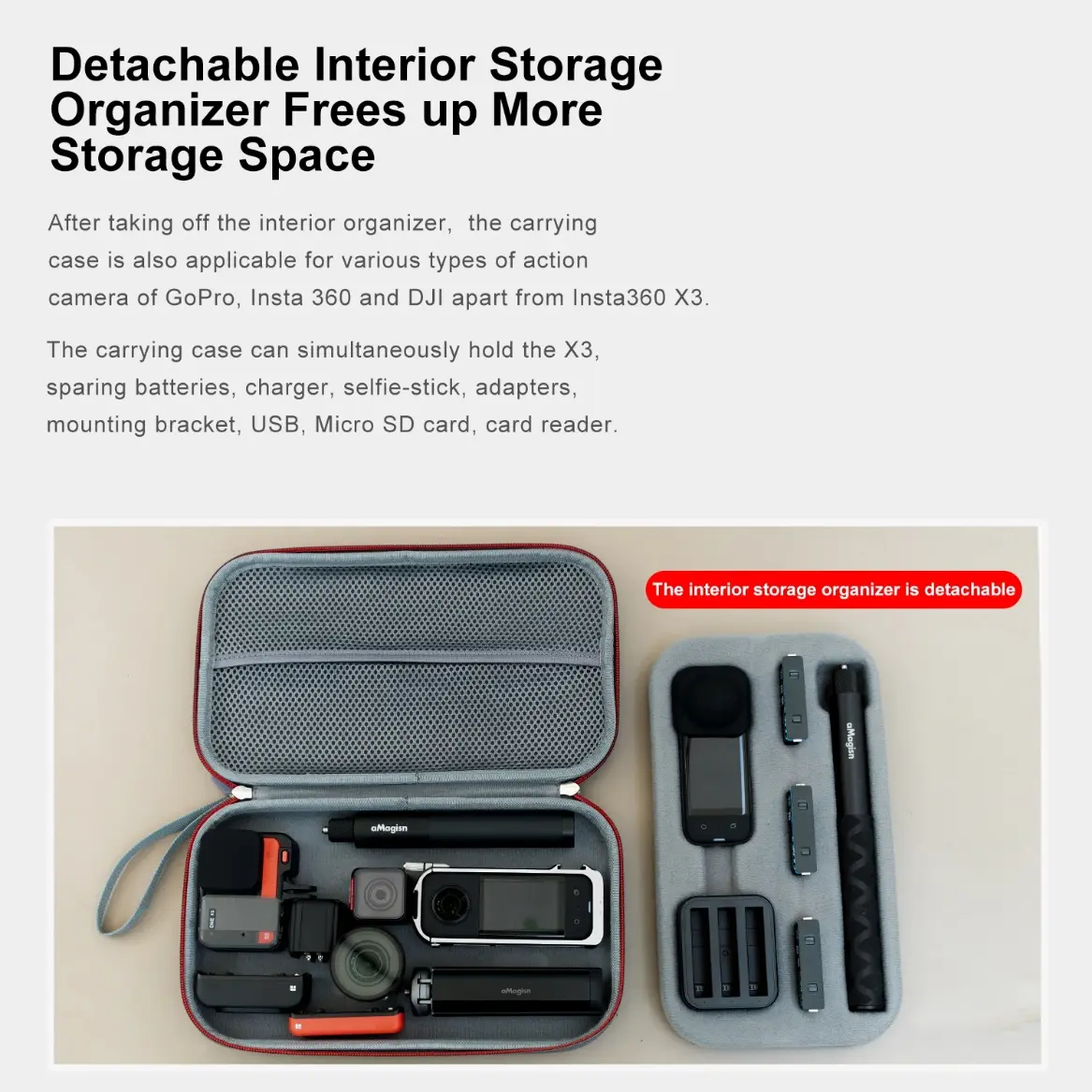 3. Removable inner tray, after taking out the inner tray, it can be compatible with GoPro Hero, GoPro MAX, Insta360 X3 / ONE RS / ONE X2 / GO2, DJI Action and so on