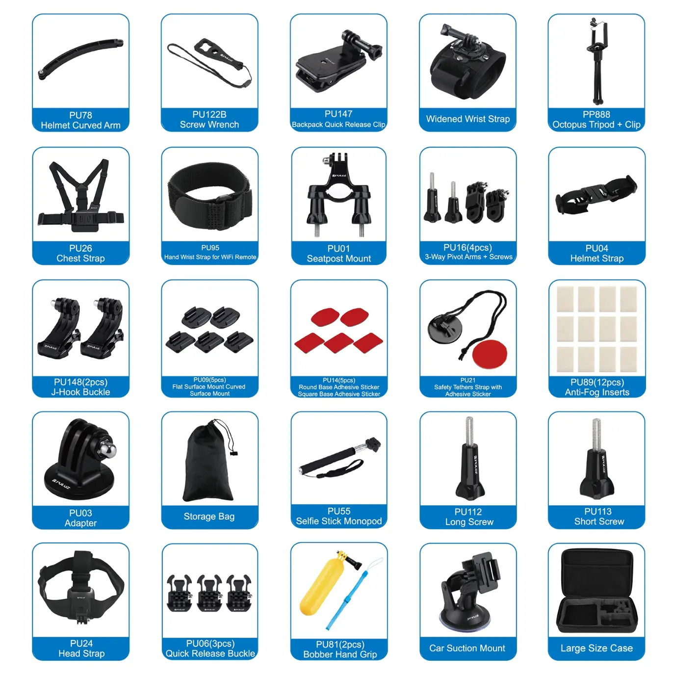 PULUZ 50 in 1 Accessories Total Ultimate Combo Kits with EVA Case (Chest Strap + Suction Cup Mount + 3-Way Pivot Arms + J-Hook Buckle + Wrist Strap + Helmet Strap + Extendable Monopod + Surface Mounts + Tripod Adapters + Storage Bag + Handlebar Mount) for GoPro, Insta360, DJI and Other Action Cameras