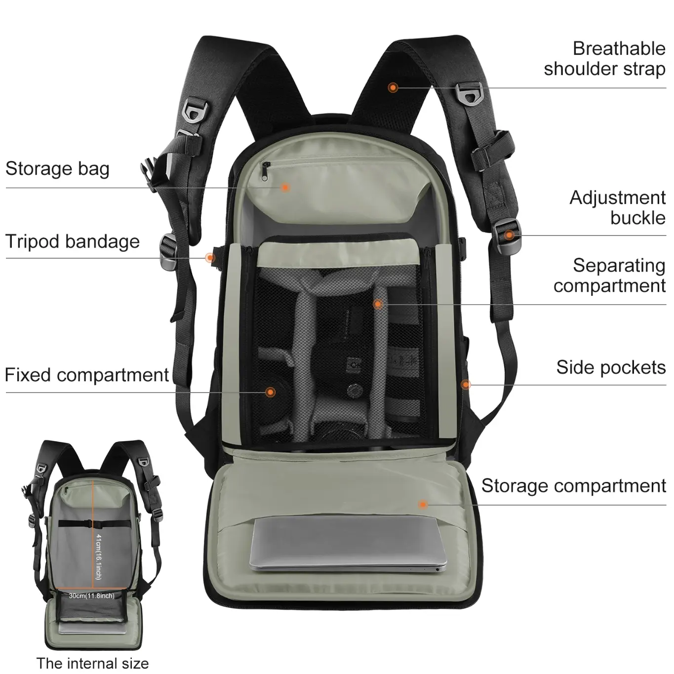 5. The main pocket equips with a variety of sub bags: Camera bag, notebook bag, tablet PC case, phone case, magazine or cloth case, sunglasses or small objects case, independent water bottle bag, etc.